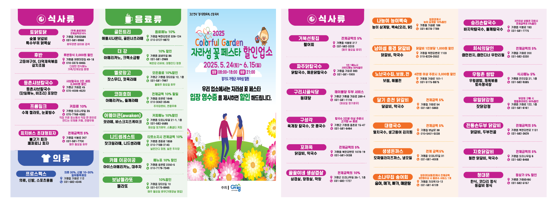 축제 입장권을 제시하면 가평 주변 주요 관광지에서 10~20% 할인 혜택을 누릴 수 있습니다. 여행 경비를 아끼며 이색 코스를 즐겨보세요!