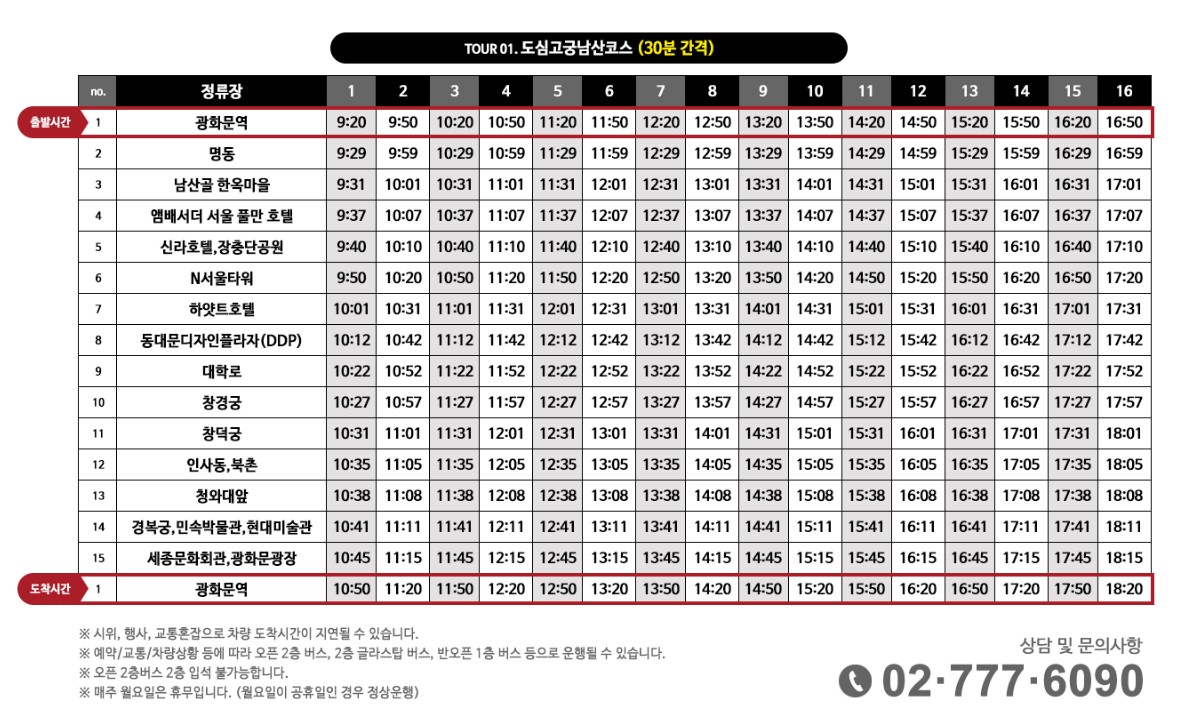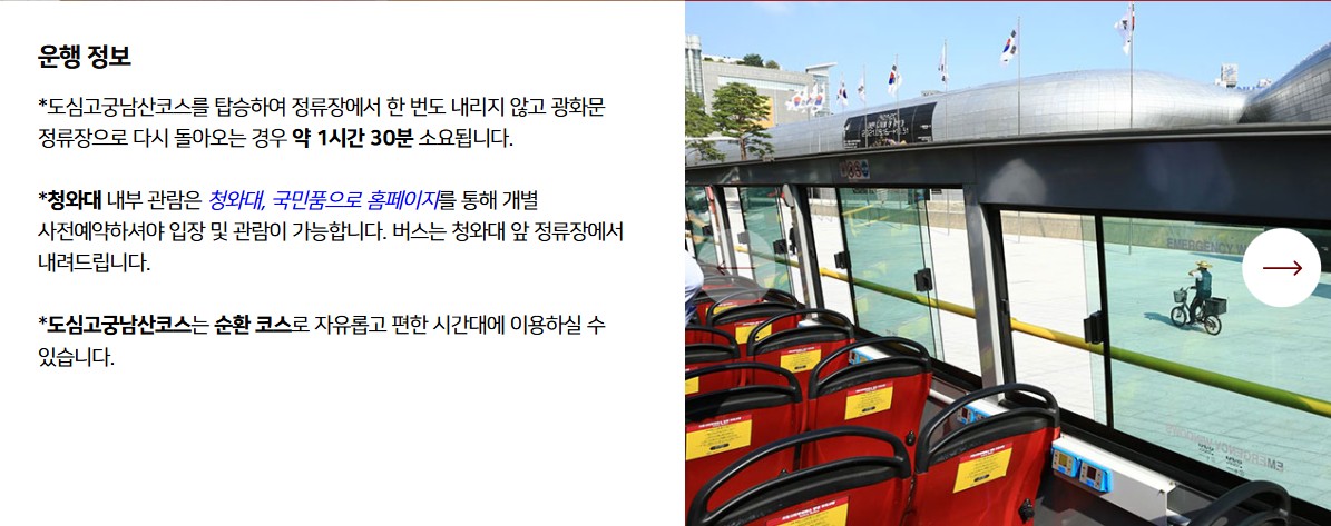 - 배차 간격: 약 30~40분 - 야경코스: 오후 7시 30분 출발 (1일 1회, 지정 좌석제)