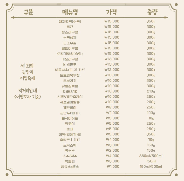 축제 기간 중에는 민락회촌을 비롯한 수영구 관내 제휴 음식점들이 일부 메뉴를 할인된 가격에 제공합니다.