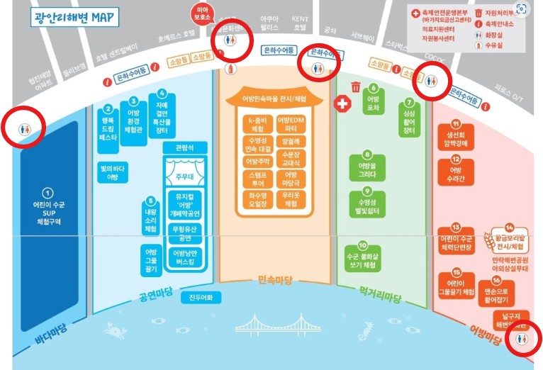 | 민락수변공원 화장실 | 민락회센터 옆 | 대형 부스 근처, 축제 방문객 다수 이용 |