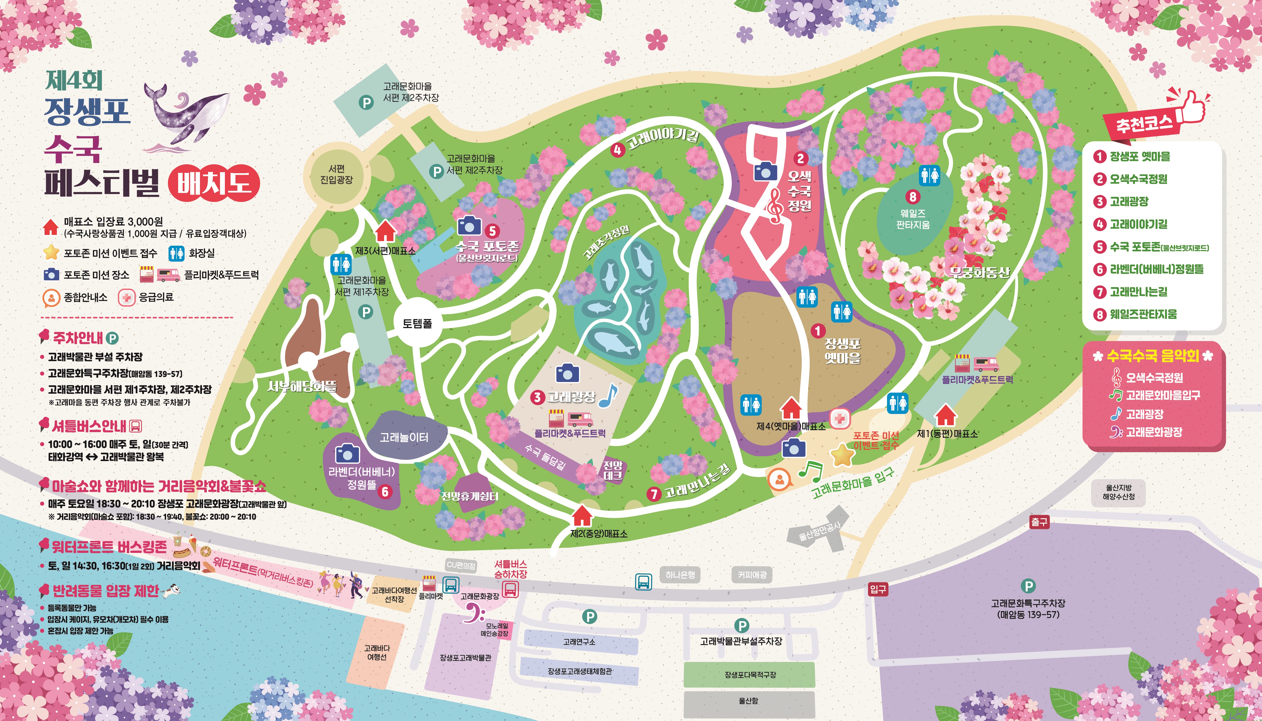⏰ 체험 부스는 대부분 오전 10시부터 선착순 마감이며, 우천 시 일부 부스는 운영이 중단될 수 있습니다. 반려동물 동반은 가능하나, 리드줄 착용은 필수입니다. 인근 공영주차장은 고래박물관 맞은편과 수국언덕 초입에 마련되어 있습니다.