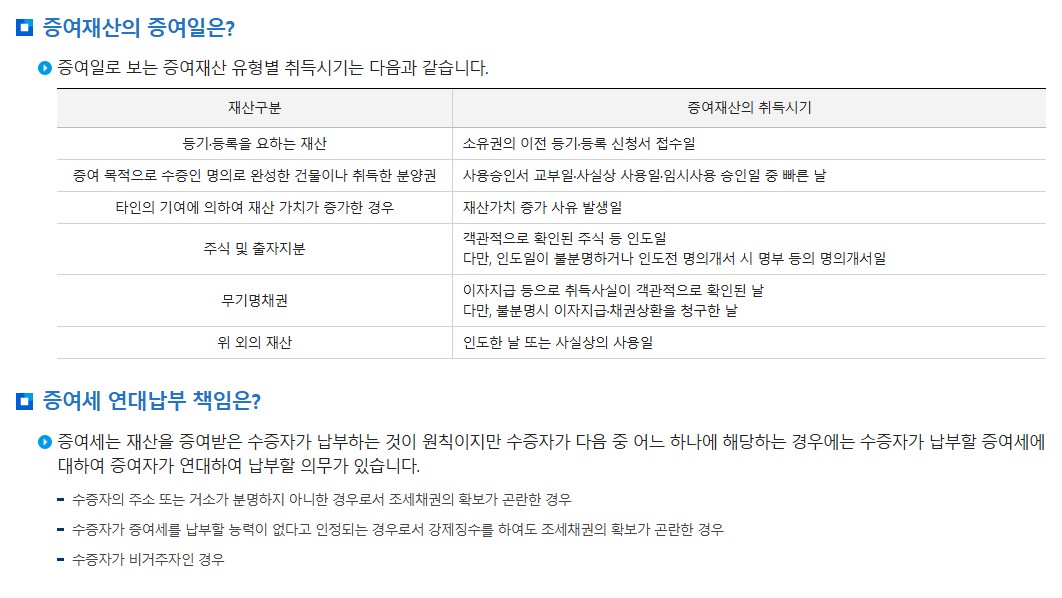 | 과세 시점 | 증여일(실제 재산이 이전된 날)을 기준으로 과세 |