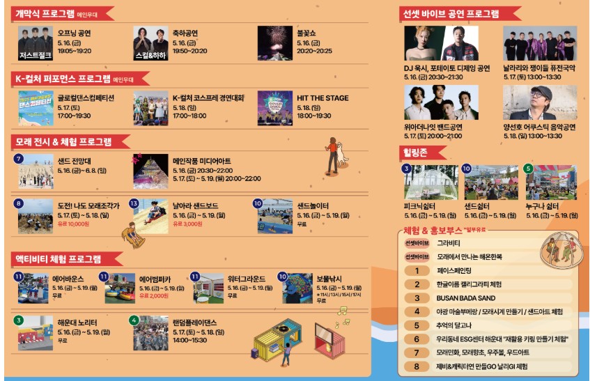 | 메인 축제 | 5.16.(금)~5.19.(월) | 해운대해수욕장 해운대광장(구남로) |